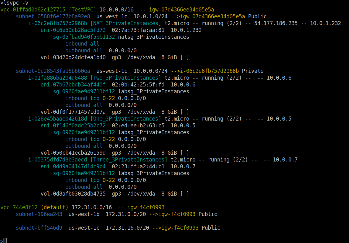 lsvpc uses the same AWS credentials as your aws-cli. My preferred setup is to set the AWS_PROFILE environment to the appropriate profile name. lsvpc defaults to a terse readout, and can be passed a -v flag in order to produce a more verbose readout: