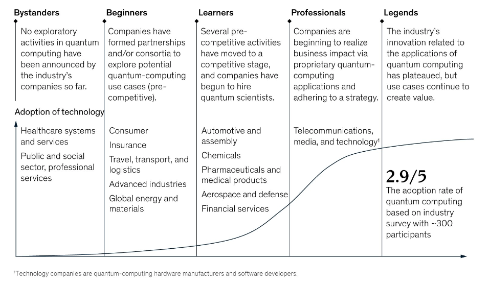 McKinsey created an interesting and useful quantum computing maturity model that tracks maturity across five categories.